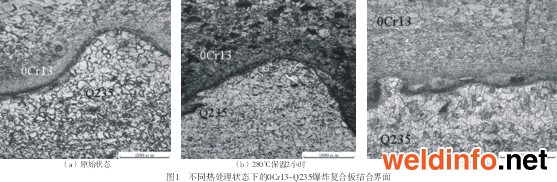 在壓力容器行業中,特別是一些用于化學工業的設備,由于長期在具有腐蝕性的環境中服役,因此對其制造材料的耐腐蝕性能有很高的要求。如果用單一的耐腐蝕材料進行制造,雖然滿足了使用要求,但是大大提高了生產成本。可以考慮在保證材料強度和使用性能的前提下,通過在價格相對便宜的基板上復合一層耐腐蝕板材來達到降低成本的目的[1]。 本文以0Cr13不銹鋼-Q235碳鋼爆炸不銹鋼復合板為試驗對象,研究了不同熱處理時長對其結合界面在組織形態、元素擴散及顯微硬度等方面的影響,為確定合適的熱處理時間提供了理論指導。